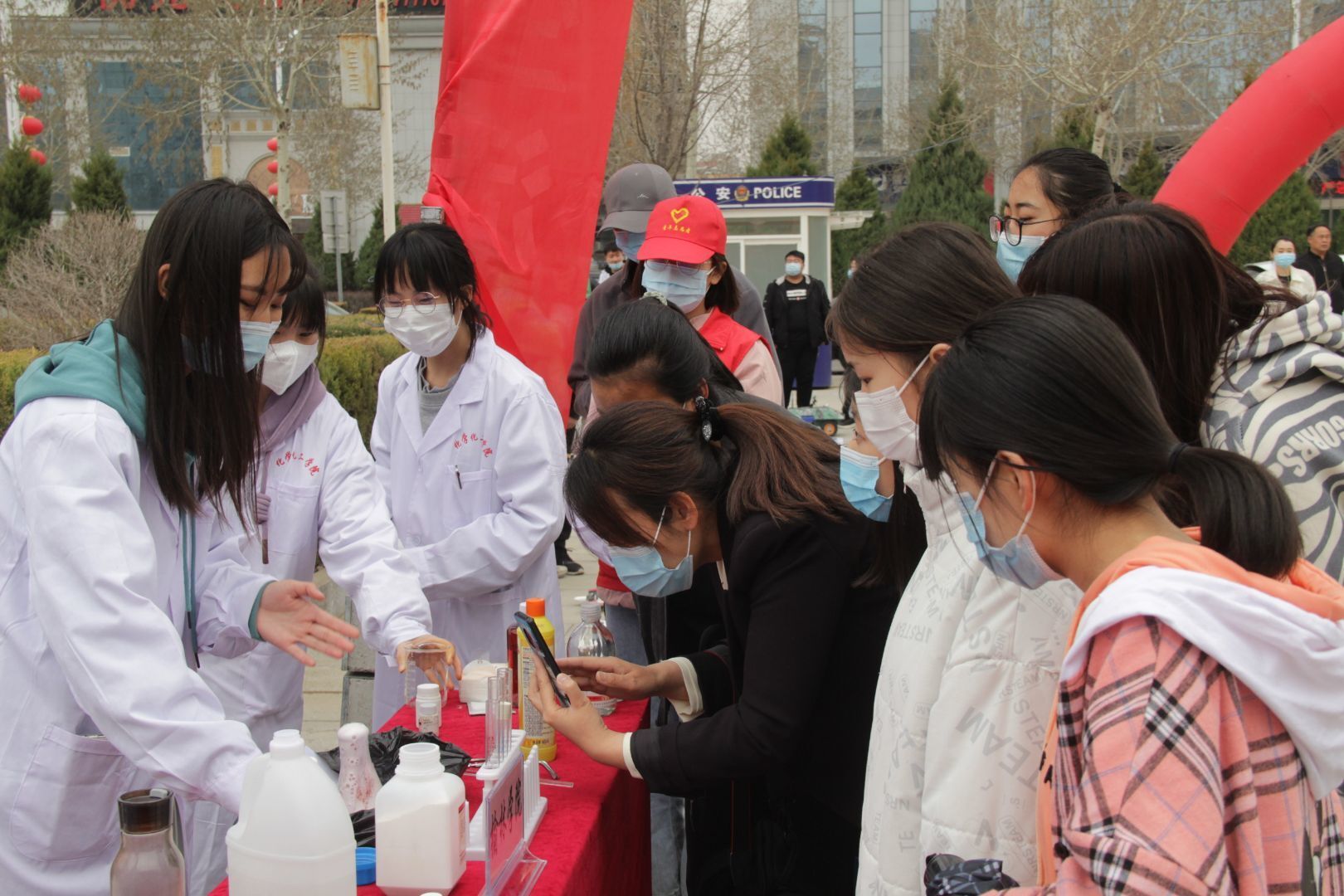 3月25日下午2点,由“心连心”志愿者所组成的实验小分队在王瑞月老师及“心连心”副队长张怡的带领下,向群众展示了精彩的化学实验美丽的桐树、大象牙膏、水下公园、防火布、化学红绿灯、隔空灭火、清水变豆浆。有趣的化学实验吸引了许多群众的目光,志愿者们耐心的向市民解释实验原理,对市民们的提出的问题也一一予以解答,得到了广大市民的肯定。