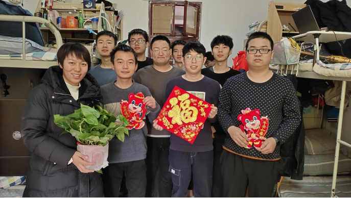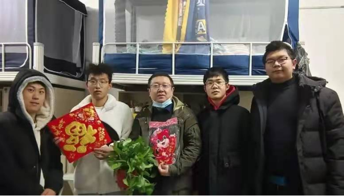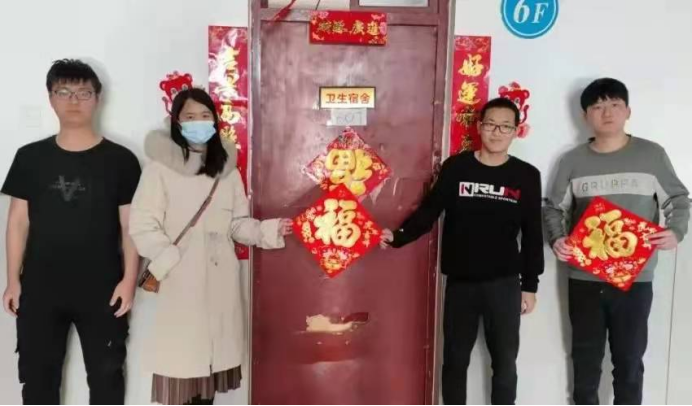 2022年1月1日上午10:00,领导老师们来到员工宿舍,亲自为每个宿舍贴上“福”字,送上小红花,祝福同学们新的一年福气满满、万事如意。喜庆的“福”字和美艳的红花,伴随着大家的欢声笑语言,让现场充满了年味,师生纷纷合影,记录下这和谐温馨的时刻。同时,老师们亲切地叮嘱同学们要提高安全防范意识,加强锻炼,保持良好的生活学习习惯,鼓励同学们在新的一年里,珍惜韶华,在奋斗中释放青春激情、追逐青春理想!