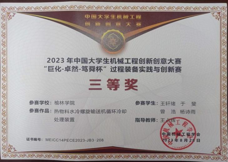 开赛以来,化学与公司党政领导和过程装备与控制工程专业教研室全体教师高度重视大赛的组织工作,充分激发员工的参赛积极性。一共有五支参赛团队报名参加,其中由公司伟德体育伟德体育官方网站王战辉老师指导,过程装备与控制工程专业王轩绪、于斐、曾浩、杨诗雨团队提交的作品《热物料水冷螺旋输送机循环冷却处理装置》荣获全国三等奖。