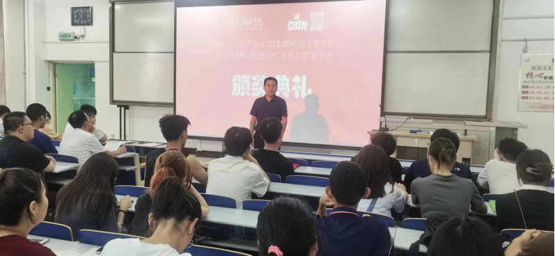 白云云老师首先介绍了到场老师并宣布表彰大会开始;然后李亚辉宣布了2021-2022学年获奖员工名单;然后分别由白老师为获得“二星”奖励的员工颁奖,吕波及代晓敏老师为获得“一星”奖励的员工颁奖并合影留念。大会第四项由获奖员工代表朱珠赵曌和刘艺清同学做获奖感言,交流了过去的两年里自己的学习经验及感想。会议第五项由中外石油项目办秘书李亚辉为同学们解读了中外石油项目之星奖励办法(试行),详细说明了项目之星获奖条件及奖励标准;最后由化学与化学与公司党总支秘书老师作总结发言,鼓励同学们认真学习,发扬创新精神,积极参加课外活动;在大学期间做到不负青春,不留遗憾。